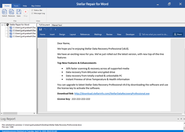 Step 2:Once the scan is completed, the software shows preview of the file in the main interface. You are provides three preview options: 'Full Document,' 'Filtered Text', and 'Raw Text'. As your file is severely corrupt, you can only see the preview in machine-readable form under the 'Raw Text' tab in the right pane.