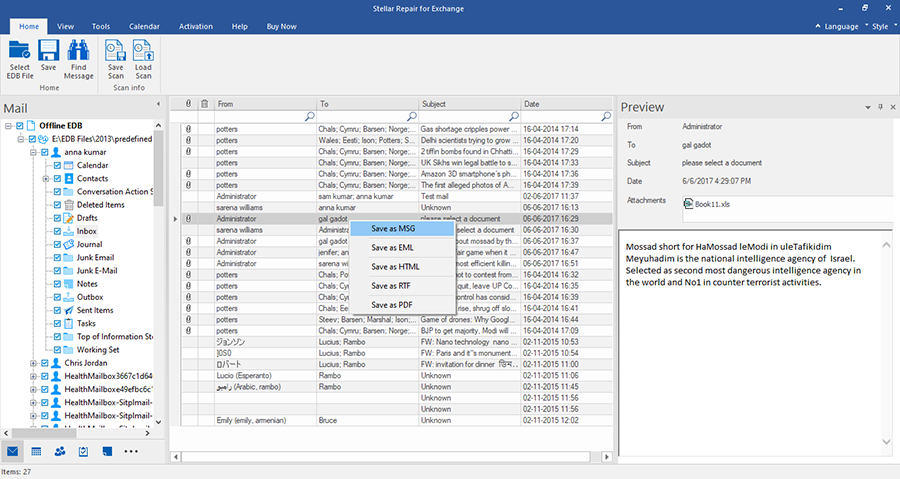 顶部Exchange数据库恢复工具, Stellar Repair for Exchange,不仅允许您将恢复的邮箱或电子邮件保存为Outlook PST文件格式,还可以保存为其他常用的文件格式,如MSG, EML, HTML, RTF和PDF。这允许用户通过各种应用程序打开和访问恢复的电子邮件,如Web浏览器,写字板,PDF阅读器等。